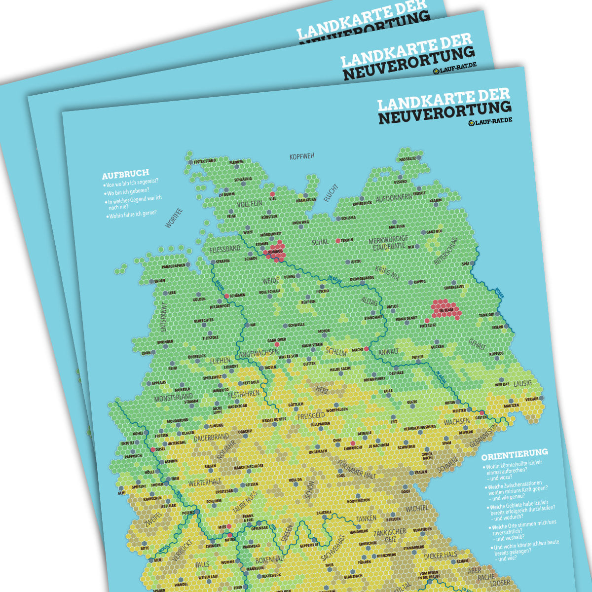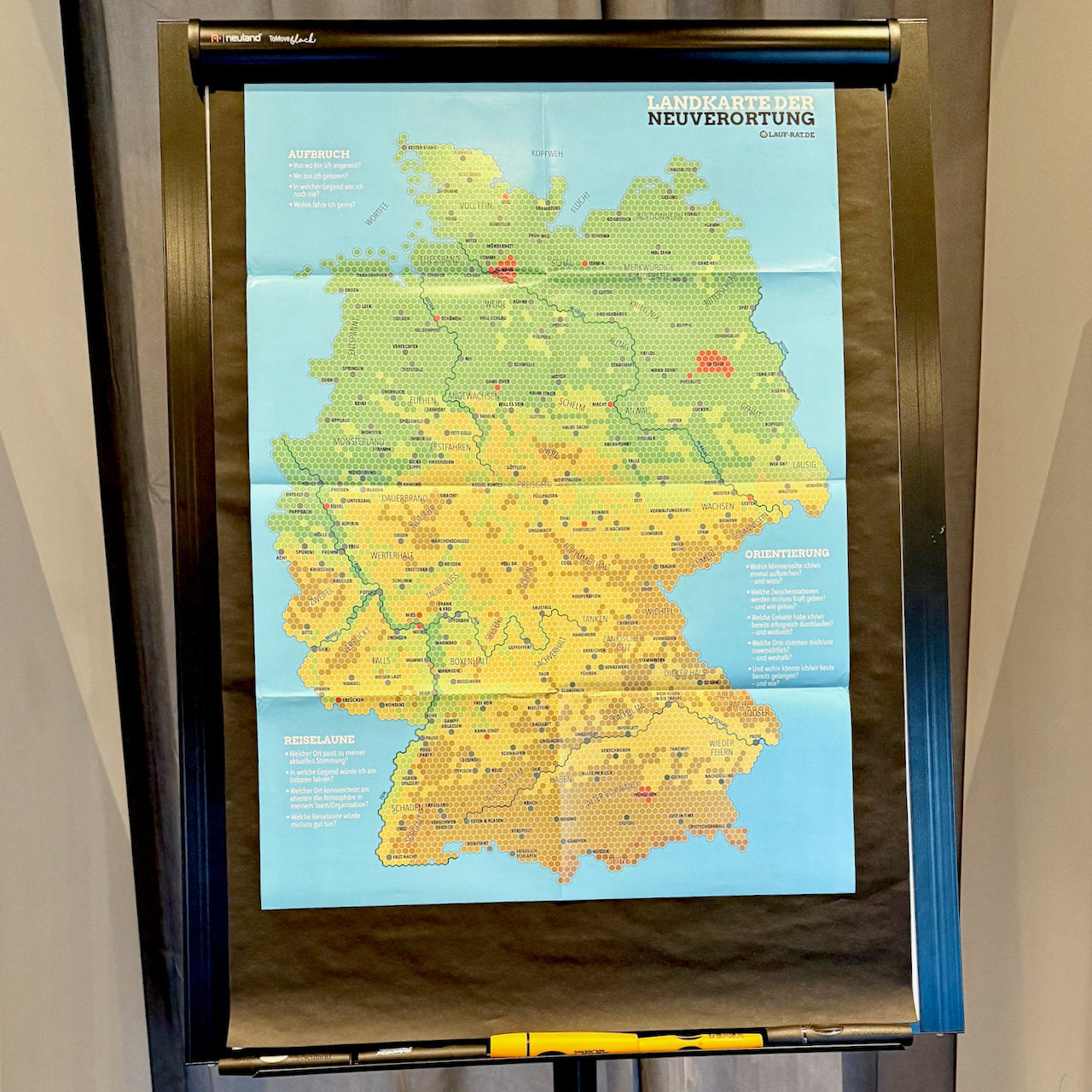 Die „Landkarte der Neuverortung“ basiert auf der Deutschlandkarte, jedoch mit klanglich abgewandelten Ortsbezeichnungen und Regionen. Dadurch lässt sie sich hervorragend (und ganz niedrigschwellig) zu Beginn von Treffen, Seminaren oder Trainings als Einstiegsmethode nutzen, um die Menschen über Ihre Herkunft in Kontakt und ins Gespräch zu bringen. Bezüglich der tatsächlichen Orte in Deutschland kann gefragt werden: