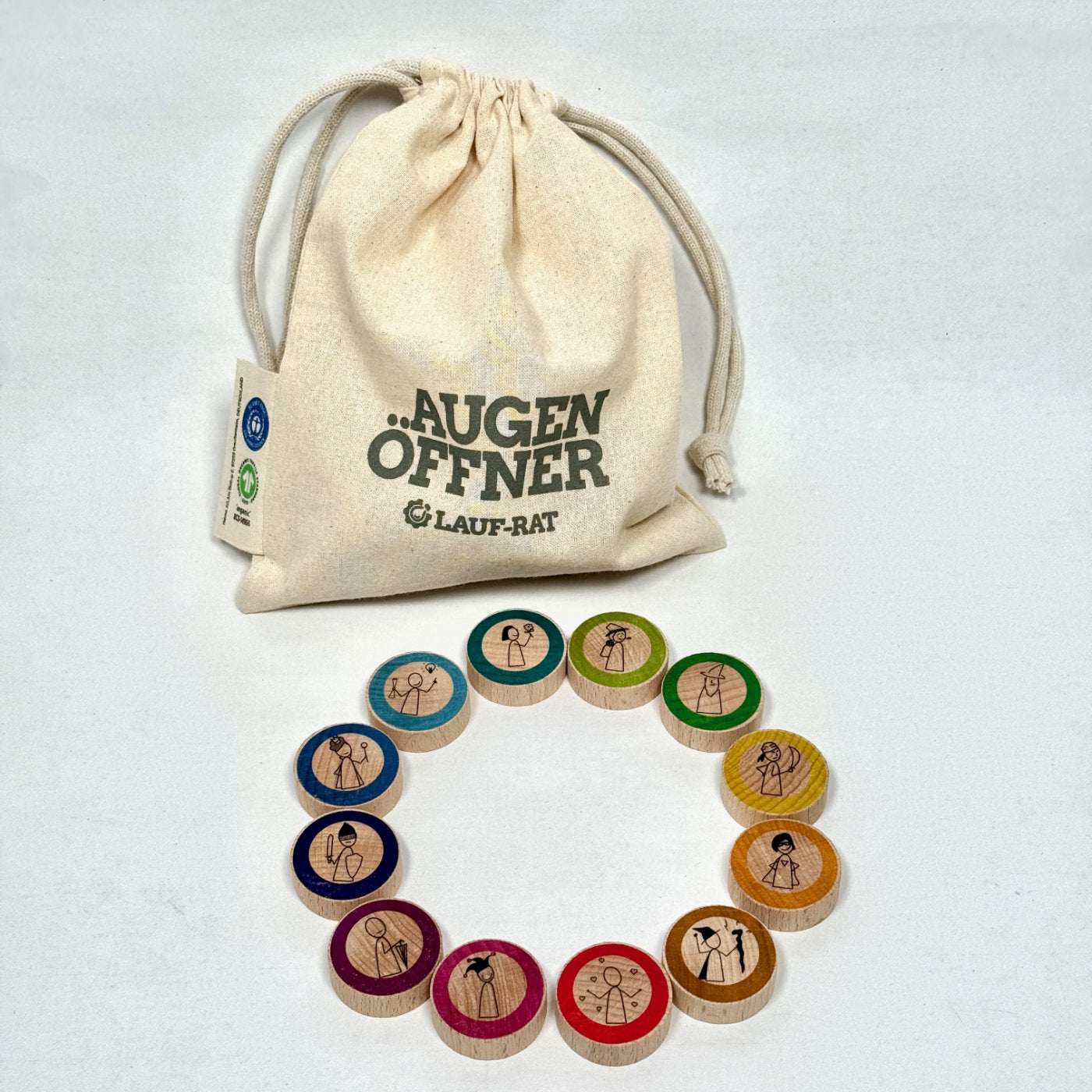 Der Beutel ist sozial und fair aus hochwertiger und fester Bio-Baumwolle hergestellt (Zertifikate: Blauer-Engel, Grüner-Knopf, Fairtrade). Die Holzsteine werden in einer fränkischen Tischlerei exklusiv für LAUF-RAT produziert.